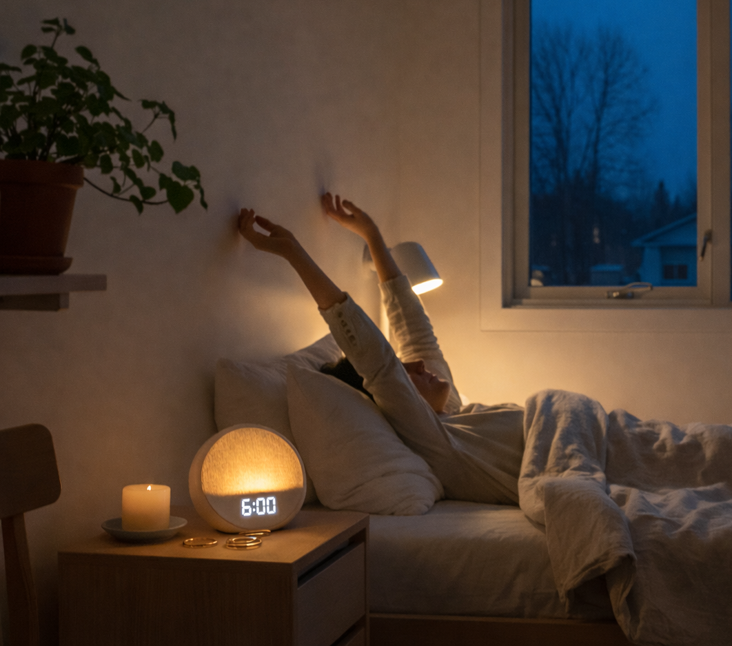 La lumière du matin aide ton cerveau à comprendre que la nuit est finie. Les études en chronobiologie montrent qu’une lumière qui augmente avant l’alarme rend le réveil plus facile et plus naturel, surtout en hiver ou si tu dors dans le noir complet.